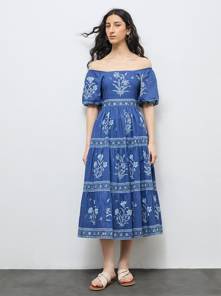 Bombay Paisley Blue Floral Cotton Tiered Dress