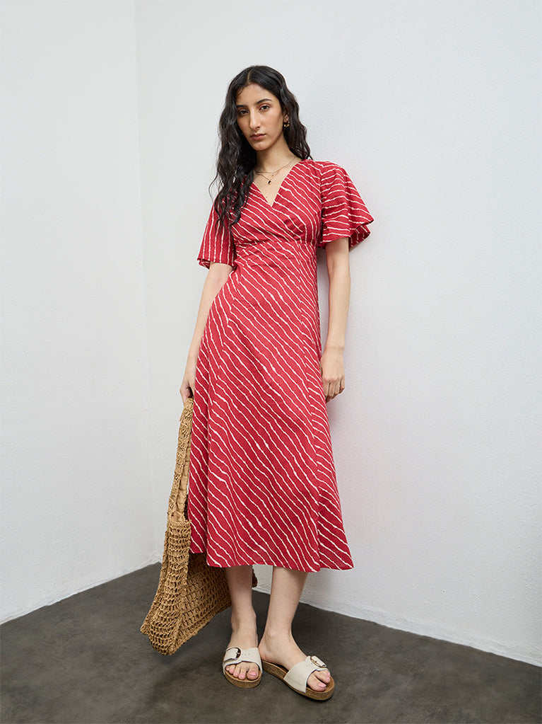 A refreshing addition to your summer wardrobe, this red dress from Bombay Paisley showcases stripe patterns on an A-line structure. It is styled with a V-neck, angel sleeves and completed with a back zipper for an easy wear experience. Crafted from a cotton-rich fabric, this is well suited for warm days, casual plans, and relaxed styling.