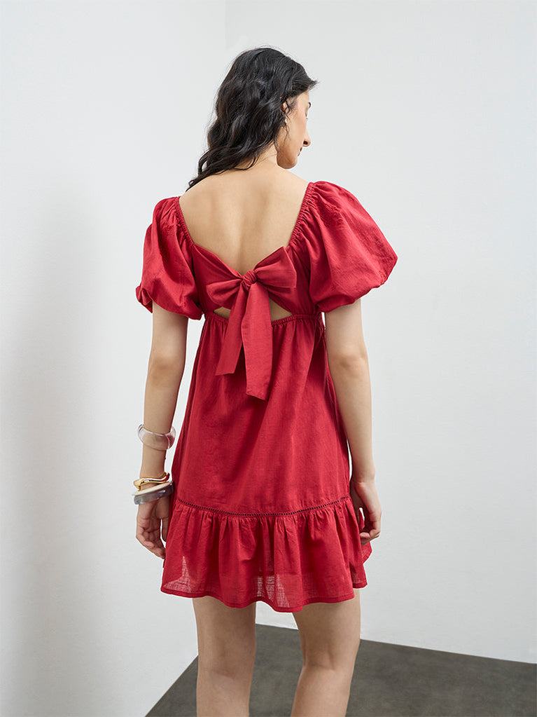 Make a confident style statement in this red A-line dress by Bombay Paisley, designed with a flattering square neckline and voluminous puff sleeves. Delicate paisley embroidery flows across the silhouette, while tie-up detailing at the back adds a feminine finish—perfect for standout summer moments.