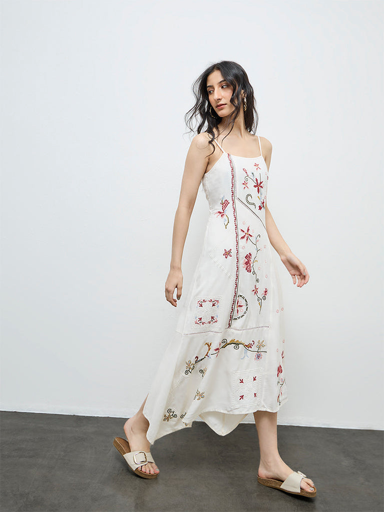 Drift into holiday ease with this off-white dress from Bombay Paisley, detailed with floral embroidery along the front. Crafted from a breathable fabric, it features a square neckline and adjustable shoulder straps for a personalised fit. The asymmetric hemline adds fluid movement, making it a natural pick for sun-soaked getaways and relaxed weekends.