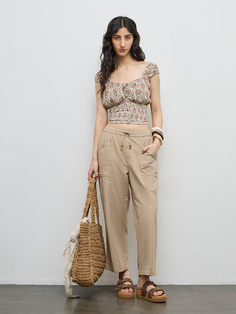 Elevate your casual wear rotation with this beige top from Bombay Paisley exhibiting paisley patterns. It is designed with a square-neck highlighting a tie-up detail, thick shoulder straps and a smocked waist, delivering an airy silhouette. Made from a soft, lightweight fabric offering a soft feel, this top is ideal for relaxed daytime styling.
