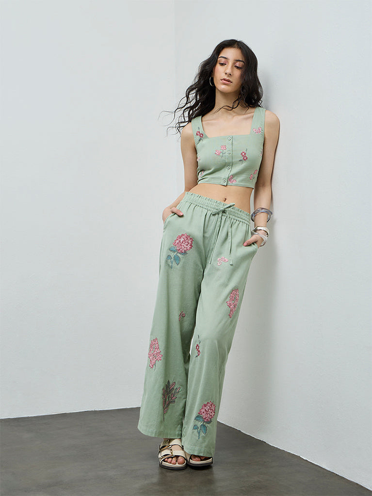 Bombay Paisley Green Floral Embroidered Cotton-Blend Top