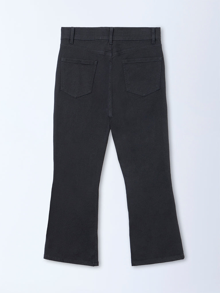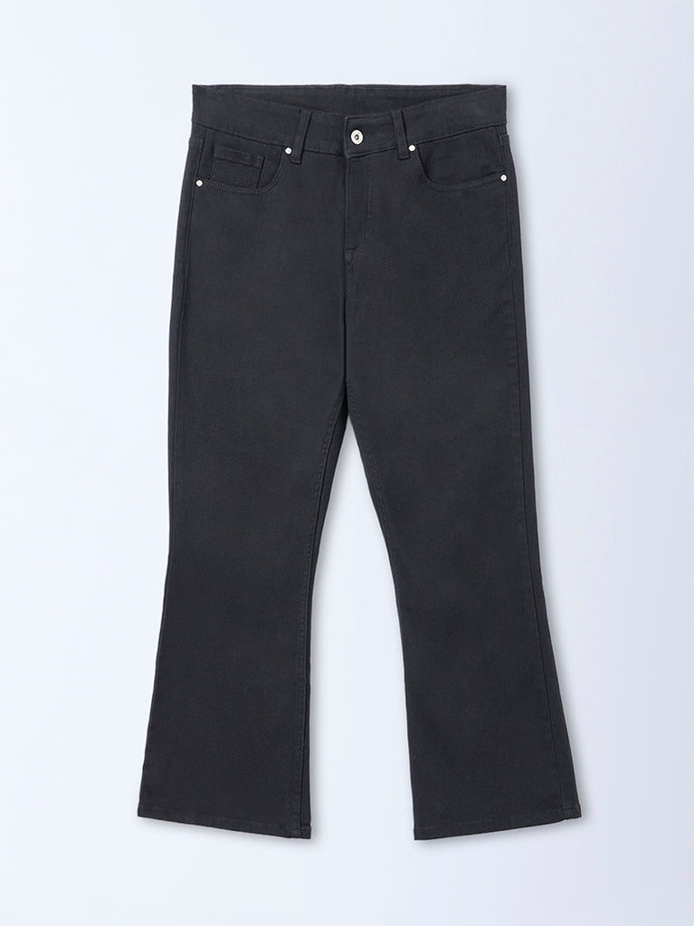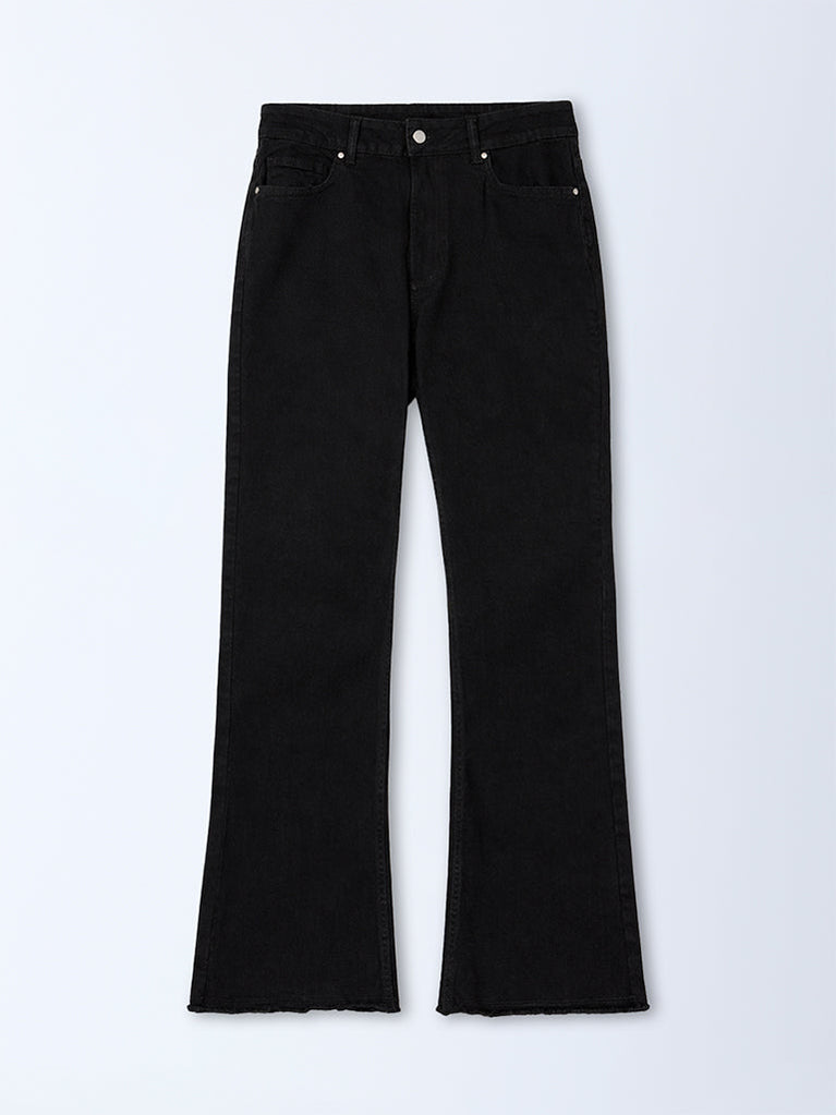 A flattering staple from Gia, these black jeans from Gia are designed in a high-rise frame with a flared structure. It is fitted with a buttoned waistband, belt loops, a zipper closure and multiple functional pockets. The cotton-blend construction ensures a comfortable feel with a polished, elongating silhouette.