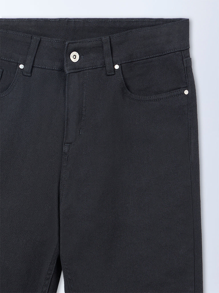Gia presents these black jeans designed to anchor everyday wardrobes. Crafted from a cotton-blend fabric, they are shaped in a high-rise frame for a flattering fit. Finished with a buttoned waistband, belt loops, a zipper placket and multiple pockets, this pair balances comfort with clean, functional detailing.