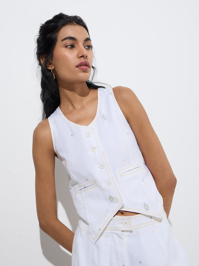 This white waistcoat-style top from Bombay Paisley is adorned with dainty prints all over. Made from a sumptuous fabric, it features a round neck that extends into a button placket and welt pockets for added practicality.