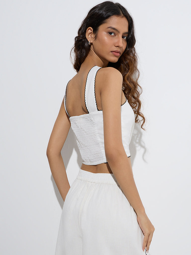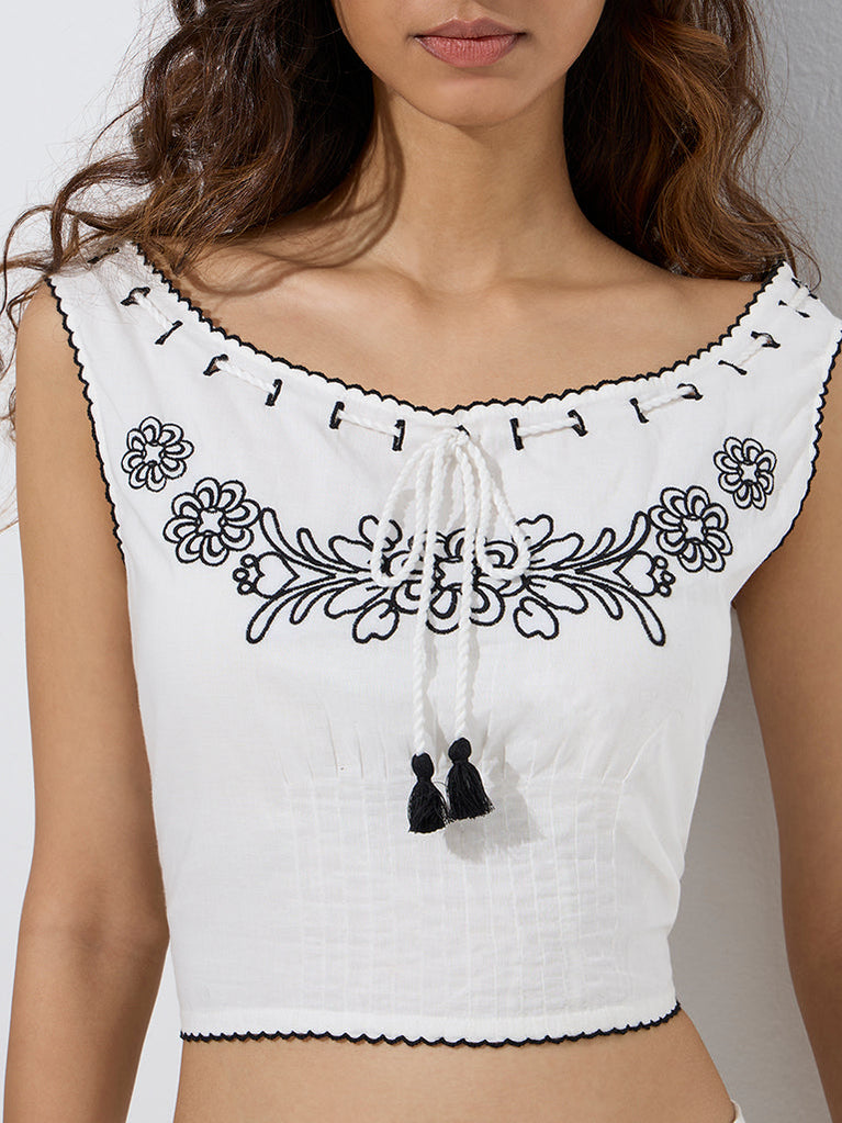 This white top from Bombay Paisley is adorned with intricate embroidery that adds a striking contrast to its minimal silhouette. Designed with a boat neck featuring a tassel-accented drawstring and a sleeveless cut, it offers a breezy appeal. The smocked panel at the back ensures a comfortable fit, while its pure cotton construction promises all-day breathability.