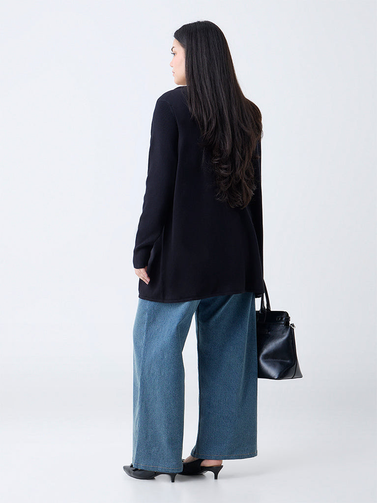 Gia brings this black top crafted from a quality fabric for lasting comfort. It features a ribbed round neck and full sleeves, enhanced with subtle embellished detailing that lends a touch of elegance, a versatile pick for both casual and polished looks.