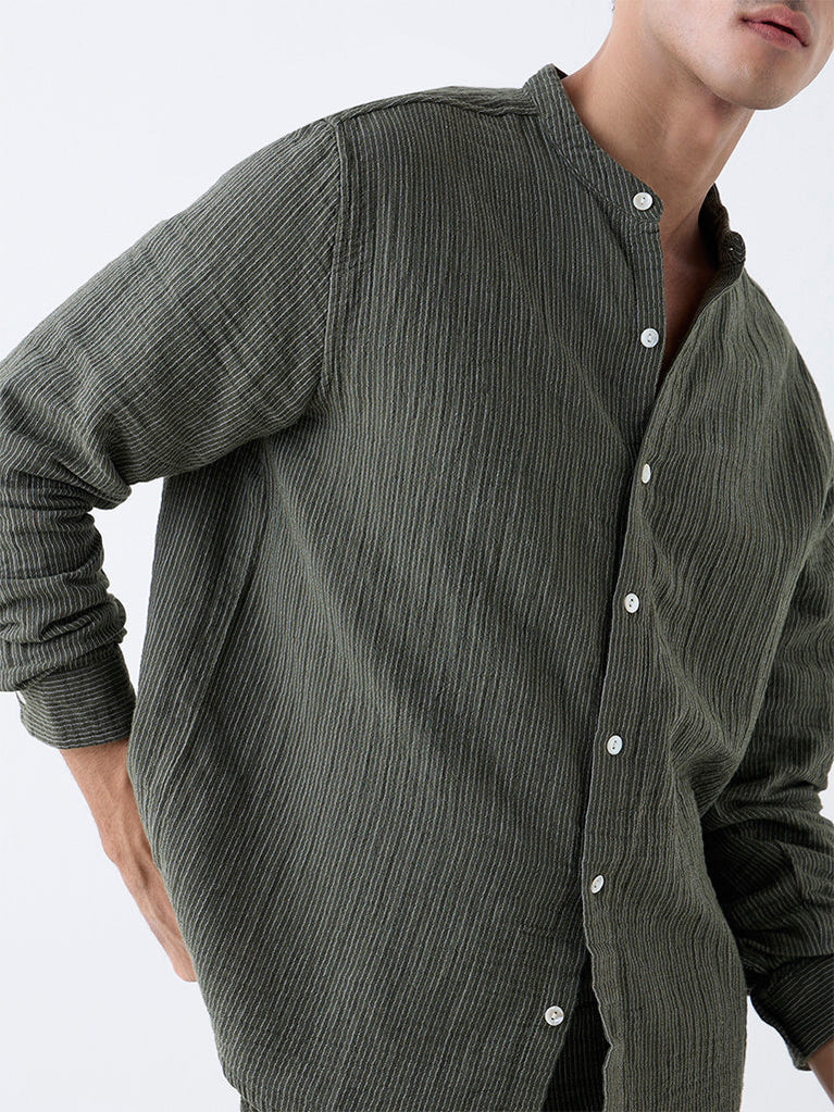 Keep it simple and stylish with this olive striped shirt from ETA. Made from breathable cotton in a relaxed frame, it features a band collar, button-down front, and full sleeves.