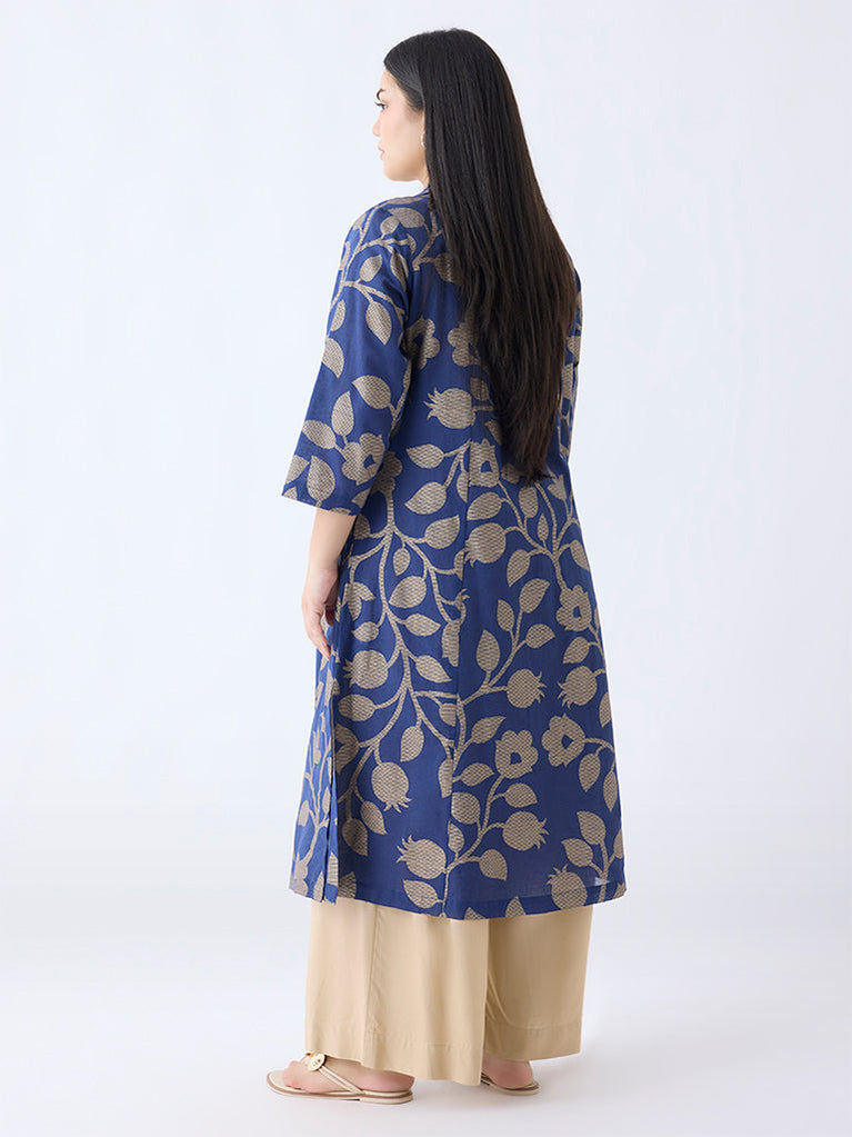 Diza Blue Floral Detailed A-Line Cotton Kurta