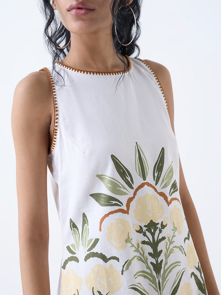 Revamp your outdoor contingent with this white shift dress from Bombay Paisley. Bold foliage prints bring a striking appeal to its clean silhouette, while the cotton-blend fabric ensures elevated comfort. Styled with a round neck and back zipper, it offers effortless wearability.