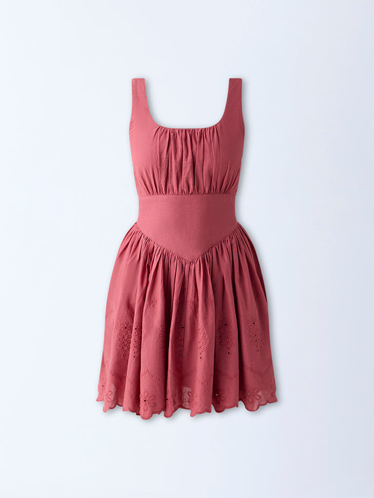 This dusty pink dress from Bombay Paisley is the kind of piece that makes everyday moments feel a little more polished. Designed with a corset-inspired waistline and softly gathered bodice, it’s finished with smocked detailing at the back for comfort and fit. The flared skirt showcases floral embroidery and scalloped edges, bringing a graceful finish to the look.