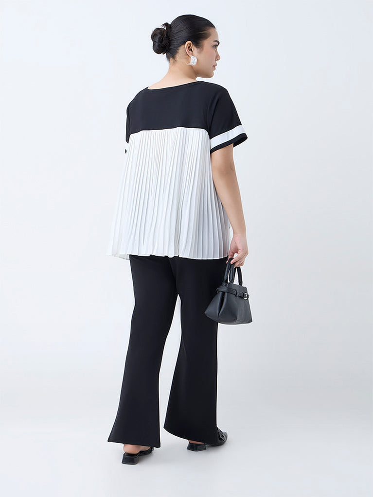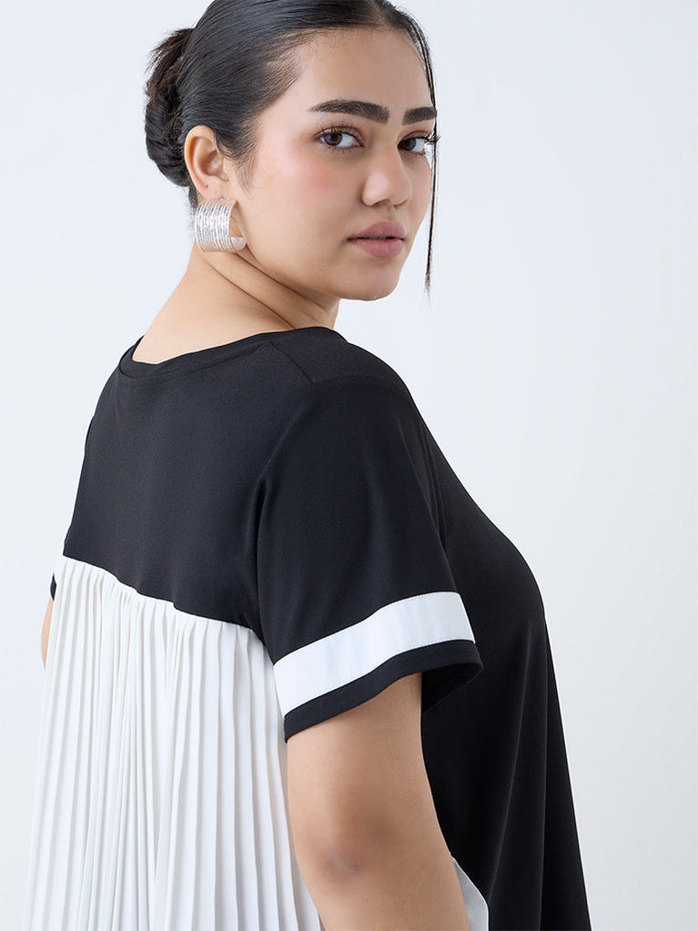 Make a stylish statement wearing this black top from Gia, fashioned in a trendy colour-blocked profile with contrasting accordion pleats at the back for a contemporary edge. Designed with a classic round neck and short sleeves, it is milled from a breathable fabric for all-day comfort.