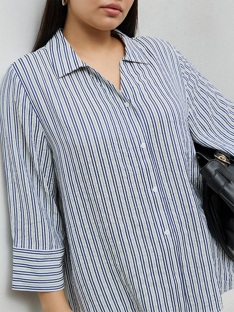 A polished appeal defines this navy striped shirt from Gia. Designed in a relaxed silhouette, it features a notch collar, a button-up front and full sleeves that lend a clean finish. Crafted from a premium-blend fabric, it offers lasting comfort, making it well suited for long, busy days.