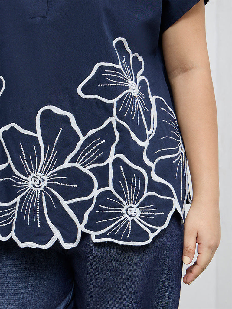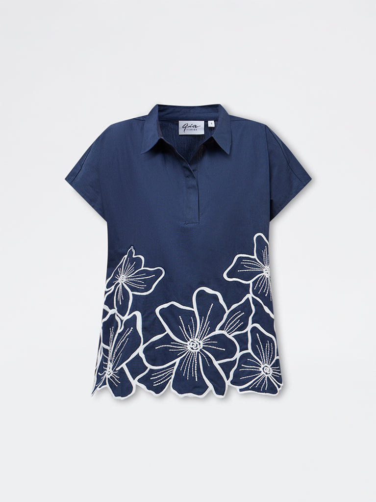 Bring a feminine accent to casual days with this navy blouse from Gia, adorned with delicate floral embroidery for subtle charm. Crafted from a cotton-rich fabric, it is designed with a collar that extends to a quarter button placket and relaxed dolman sleeves, creating an easy, contemporary silhouette.
