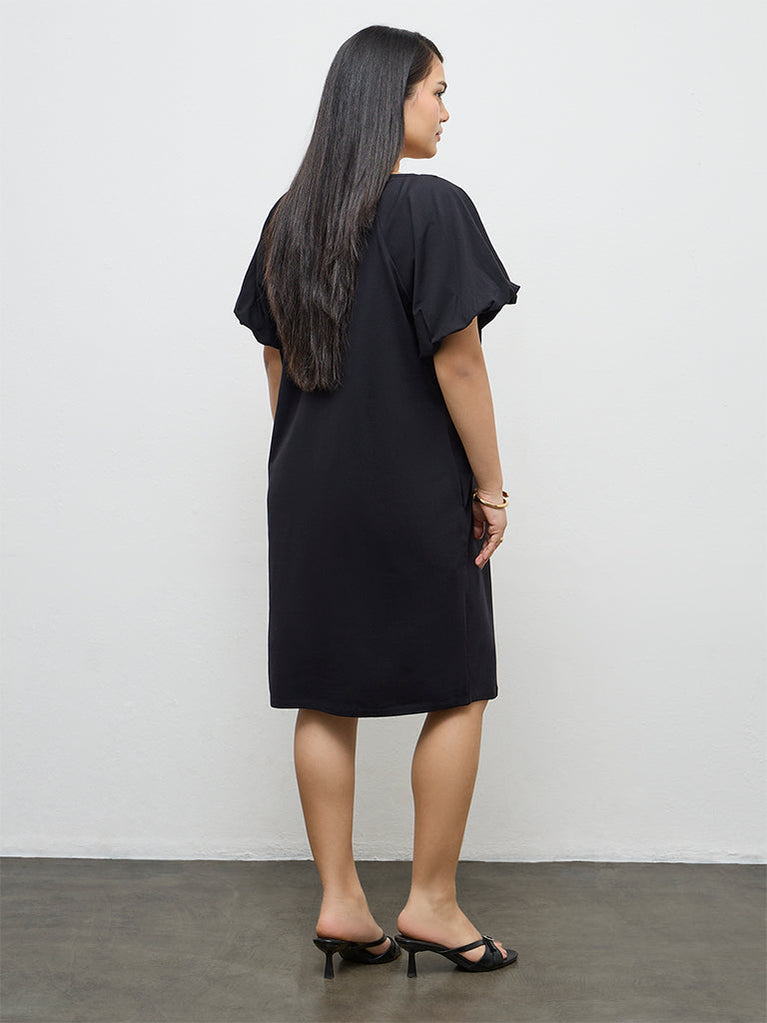 This black dress from Gia is an easy choice for day-to-day dressing. It is constructed from a lightweight fabric in an straight silhouette that allows easy movement. The design features a round neck, puff sleeves and functional side pockets. This easy and flowing design is easy way to feel put together.