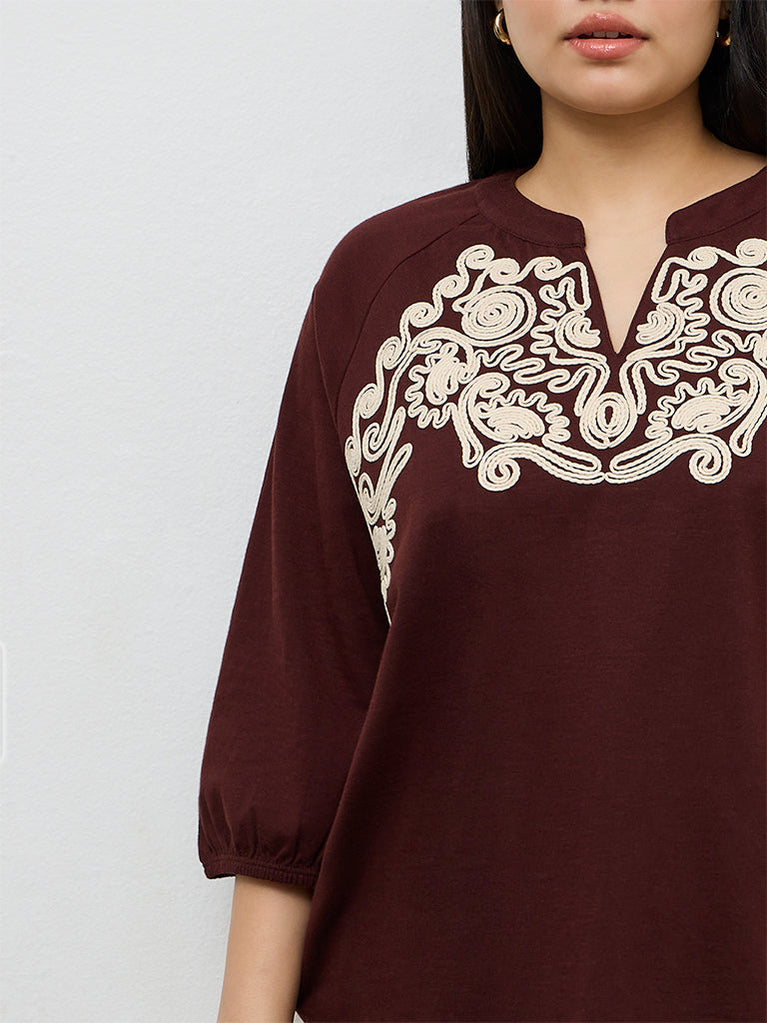 Gia presents this brown blouse designed with intricate embroidery across the front. Crafted from a breathable fabric, it ensures a comfortable feel through the day. The design features a notch neckline and raglan quarter sleeves, creating a relaxed yet refined profile that pairs effortlessly with everyday separates.