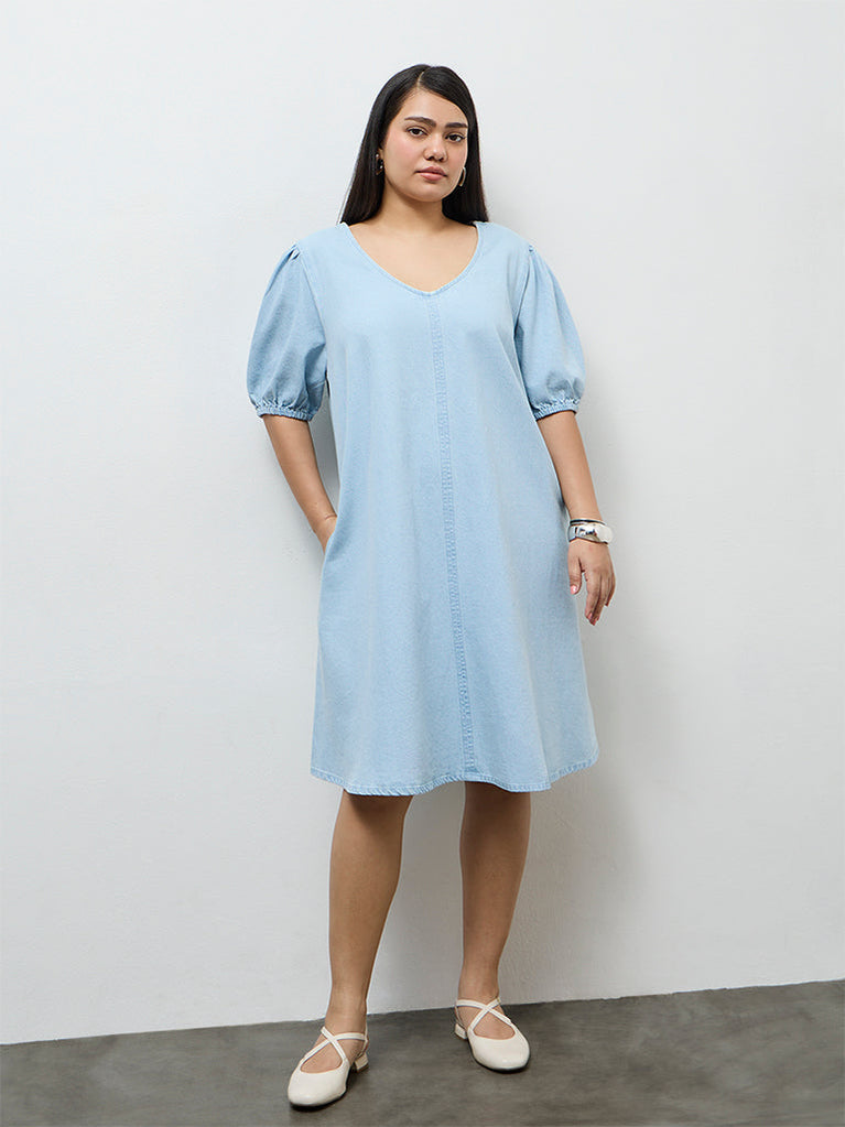 Define your evening wear rotation with this light blue denim dress from Gia. Fashioned in a breezy A-line silhouette, it is styled with a V-neckline and puff sleeves for a charming design. The lightweight fabric promises uninterrupted comfort, making it suitable for casual day-outs and warm weather occasions.