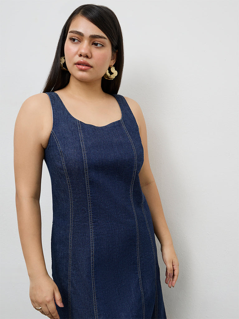 Add a touch of easy structure to your wardrobe with this dark blue denim dress from Gia. Crafted from a lightweight fabric, it is shaped in an A-line silhouette that allows comfortable movement through the day. The design features a scoop neck and a sleeveless profile, while prominent stitch detailing adds subtle character. A polished option for everyday styling.
