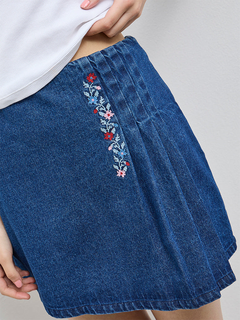 Bombay Paisley Blue Floral Embroidered Denim Skirt