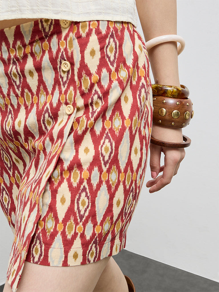 Bombay Paisley presents this red printed cotton skorts designed for comfort and ease. Finished with a clean button front for a sleek look, it features built in shorts underneath for added coverage. The lightweight base and easy silhouette make it a practical yet polished choice for everyday summer dressing.