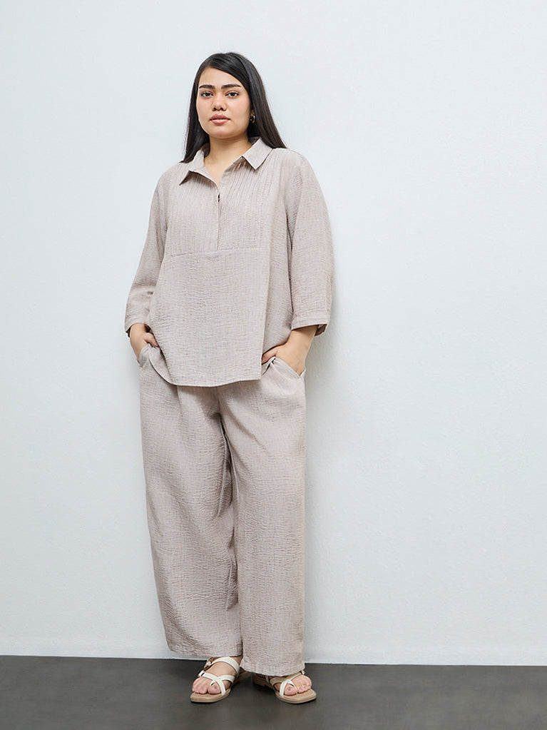 When comfort meets quiet detailing, this beige mélange blouse from Gia delivers. Designed with a collared neckline flowing into a concealed button placket, it features pintuck detailing at the yoke for soft structure. 3/4th sleeves add to its relaxed, refined feel.