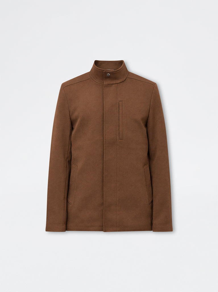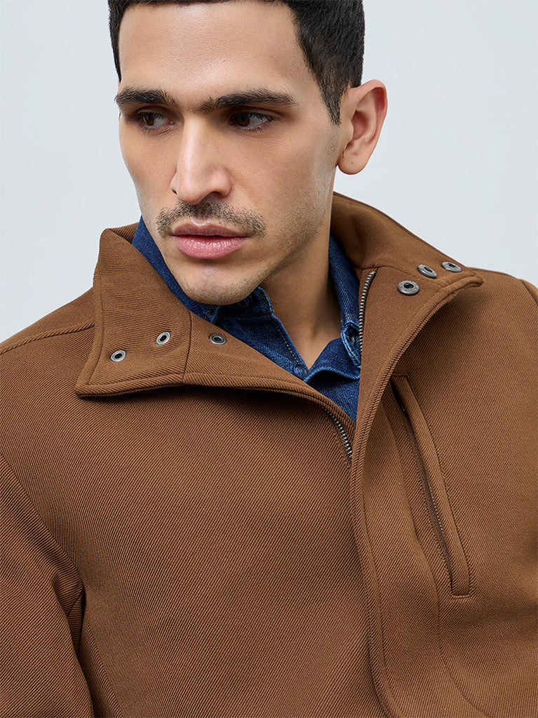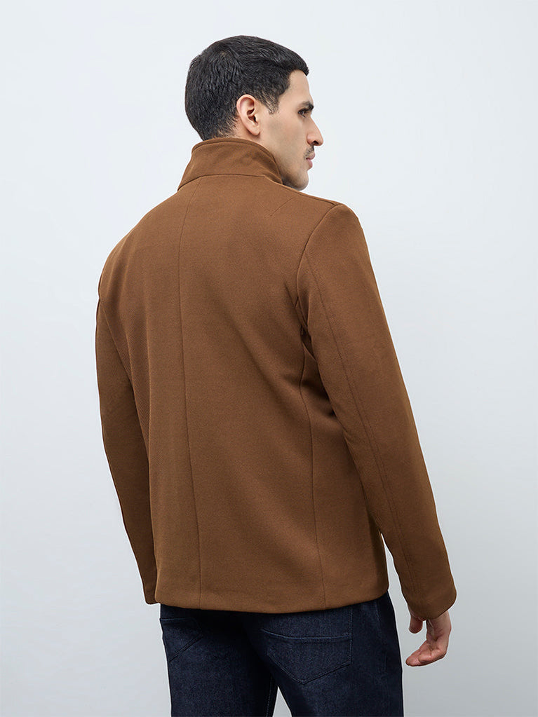 Perfect for adding a smart layer to your winter wardrobe, this tan jacket from Ascot is framed in a relaxed shape for an elevated casual appeal. It is designed with a high-neck, a zipper front with a snap buttoned placket and full sleeves for a poised profile. it is completed with a concealed pocket on the chest and kangaroo pockets along the hem, it offers both functionality and refined everyday style.