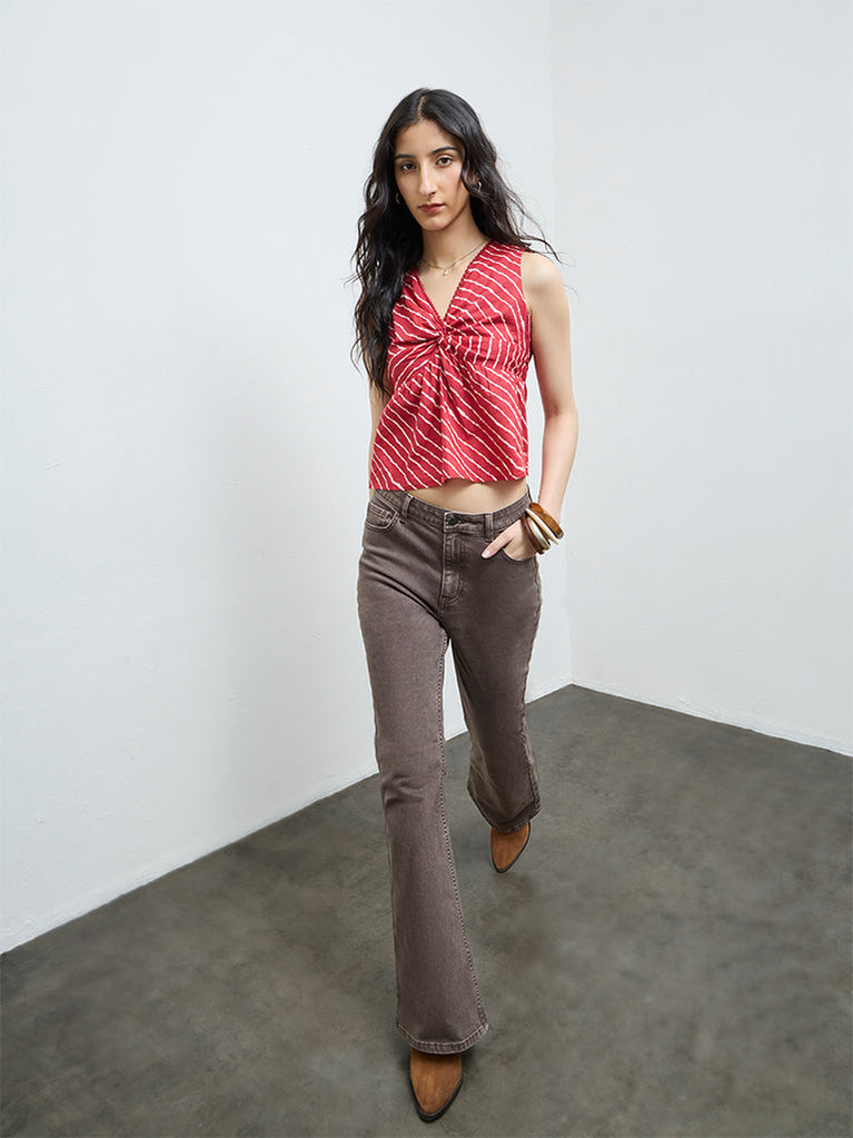 Traditional leheriya prints lend a spirited touch to this red cotton top by Bombay Paisley. A deep V-neckline with ruched detailing at the center shapes a flattering, warm-weather silhouette.