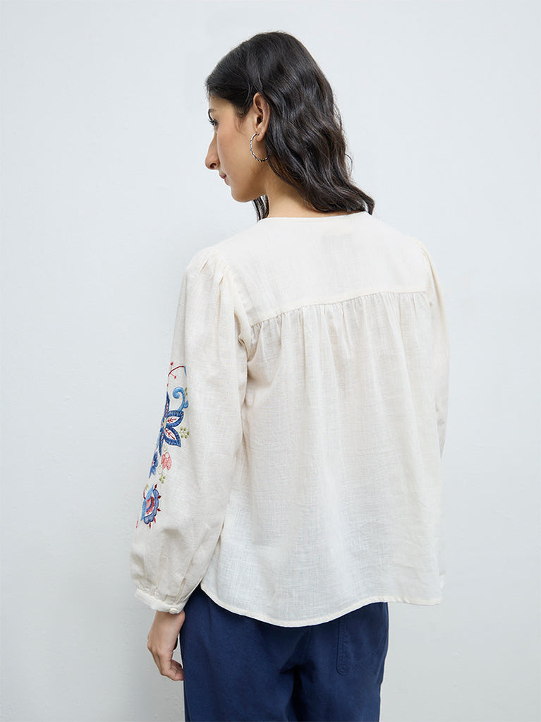 Bombay Paisley Off-White Floral Embroidered Cotton Blouse