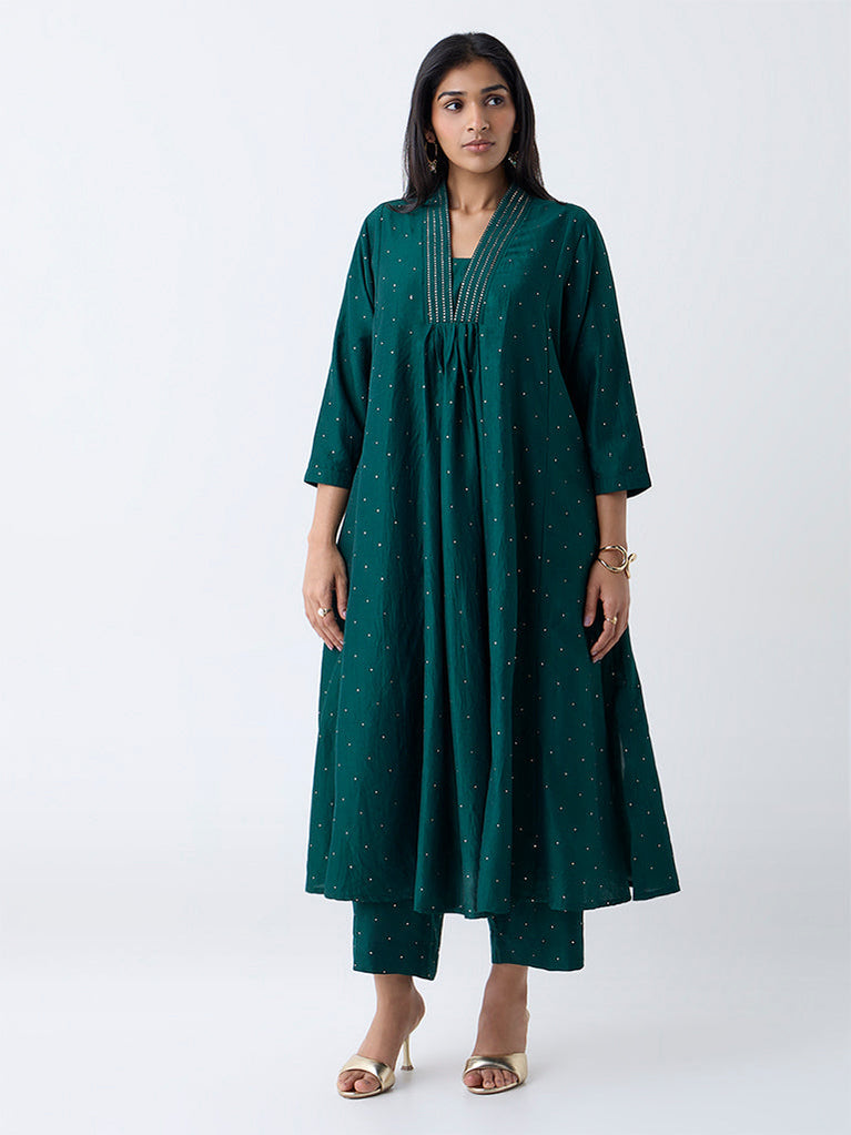 Diza introduces these emerald green ethnic pants, fitted with an elasticated waist and side pockets for a functional detail. Featuring dainty embellishments, they add a lively touch to everyday dressing and pair well with both solid and printed kurtas.