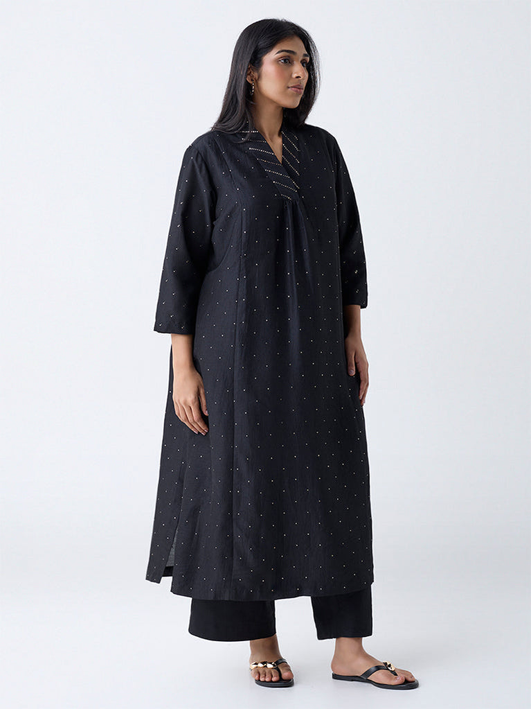 This black kurta from Diza stands out with its subtle embellishments across an A-line frame. Spun from a premium fabric blend, it features a V-neck and three-quarter sleeves for a composed finish. A refined option that transitions effortlessly through everyday ethnic wear.
