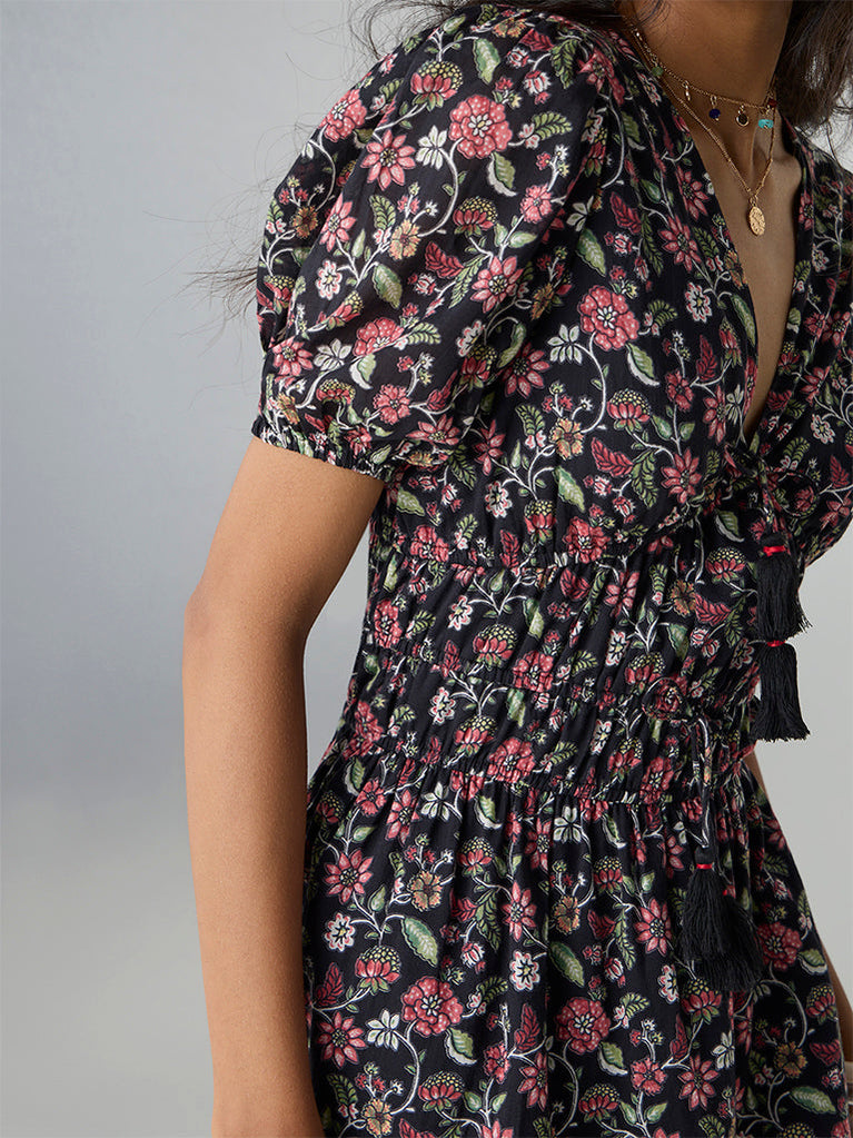 Bombay Paisley Black Floral Design Cotton Tiered Dress