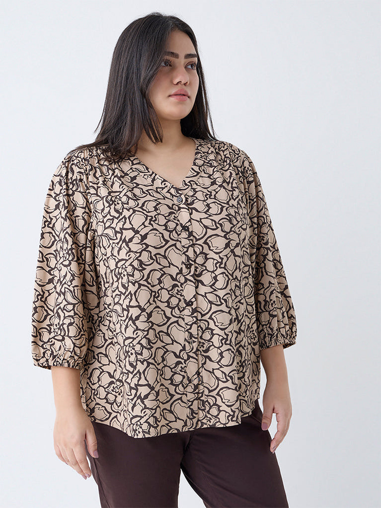 Softly detailed with a graceful floral print, this beige blouse from Gia lends a touch of femininity to everyday dressing. Cut from a breathable fabric, its flowing silhouette is designed for ease and movement. A flattering V-neck extends into a button placket, while three-fourth sleeves complete the piece with understated refinement.