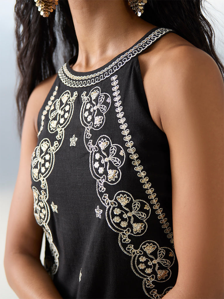 Bombay Paisley brings this black top woven from a cotton-blend fabric, promising day-long comfort. The front design features striking floral embroidery and tie-up details. Framed with a round neck and a sleeveless cut, it adds a refined edge to casual festive dressing.