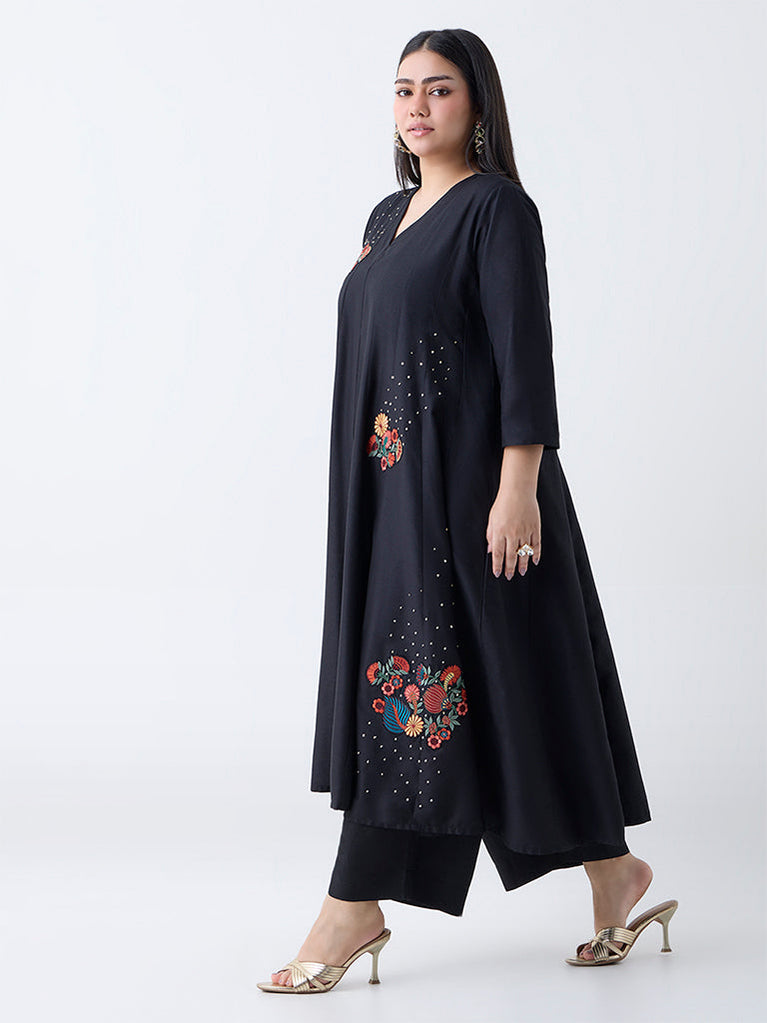 Infused with artisanal grace, this black kurta by Diza is detailed with floral embroidery and subtle embellishments for a festive sparkle. The Anarkali silhouette flows elegantly, balanced by a flattering V-neck and three-quarter sleeves. Side pockets add a modern touch of ease to this traditional design.