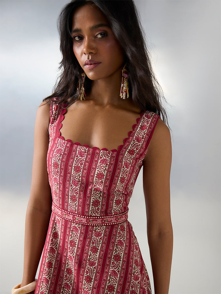 This red dress from Bombay Paisley features bold botanical prints for a striking appeal. It is styled with a V-neck, a sleeveless profile and functional side pockets. Woven from cotton-rich fabric, it’s a breezy pick for day brunches and casual get-togethers.