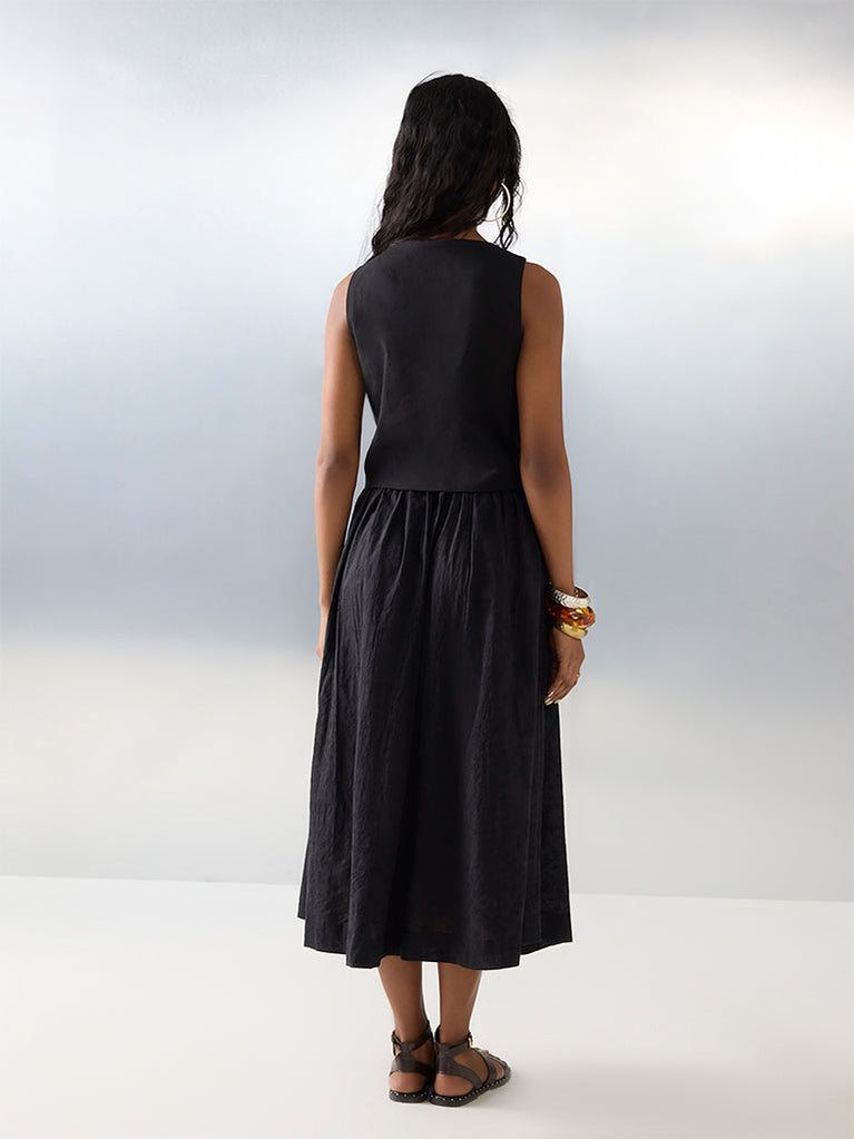 Bombay Paisley presents this black A-line dress styled with a round neck and a sleeveless cut for an easy silhouette. Featuring embellished embroidery on a breathable fabric build, it lends a subtle festive touch to everyday ethnic dressing.