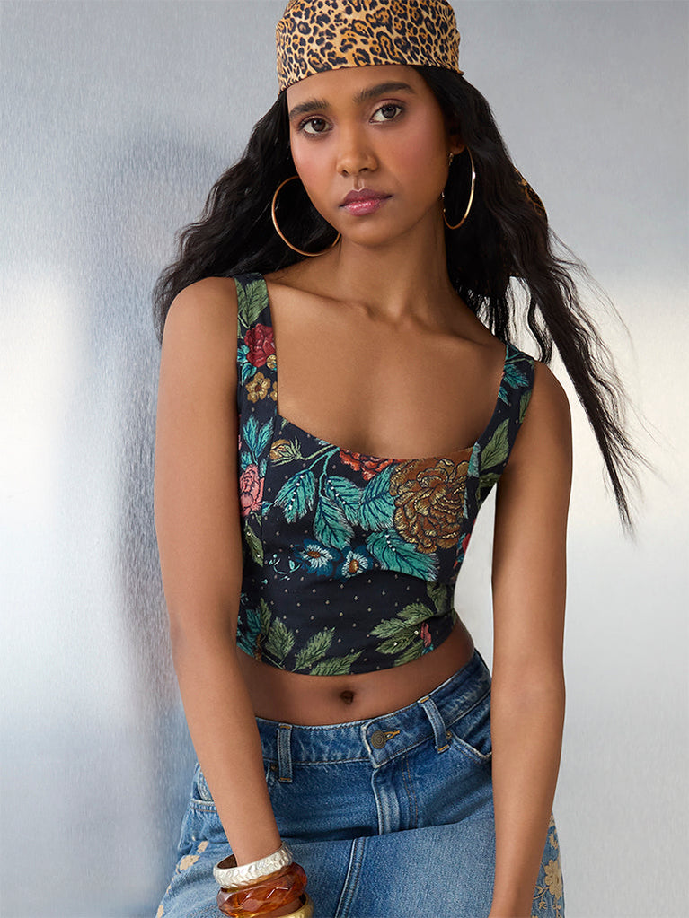 Bombay Paisley launches this black top, showcasing vivid floral prints. Woven from a sumptuous blend of cotton fabric, it is finished with a square-neck, a sleeveless profile and a smocked back for a flexible feel.
