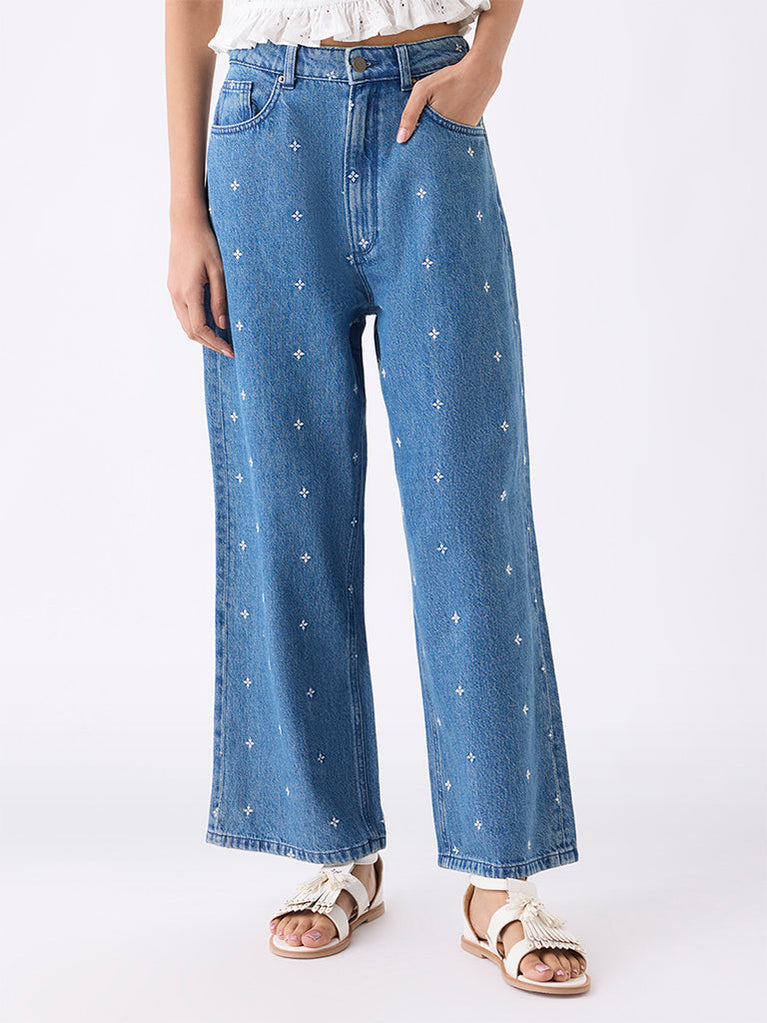Bombay Paisley launches these blue jeans as a versatile staple designed to move with your day. Delicate embroidery elevates the denim with an artisanal touch, while the flattering fit keeps the silhouette modern. Finished with a buttoned waistband, zipper fly, belt loops, and multiple pockets, this pair blends style with practicality.