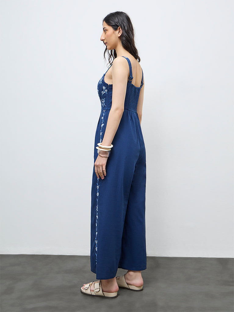Bombay Paisley presents this blue embroidered jumpsuit designed for comfort and elegance. Shaped with a sweetheart neckline and bust-stitch detailing, it features floral embroidery along the sides for added depth. Crafted from a premium fabric, it includes side pockets for convenience, a subtly flared hem and a smocked back that creates a softly cinched waist.