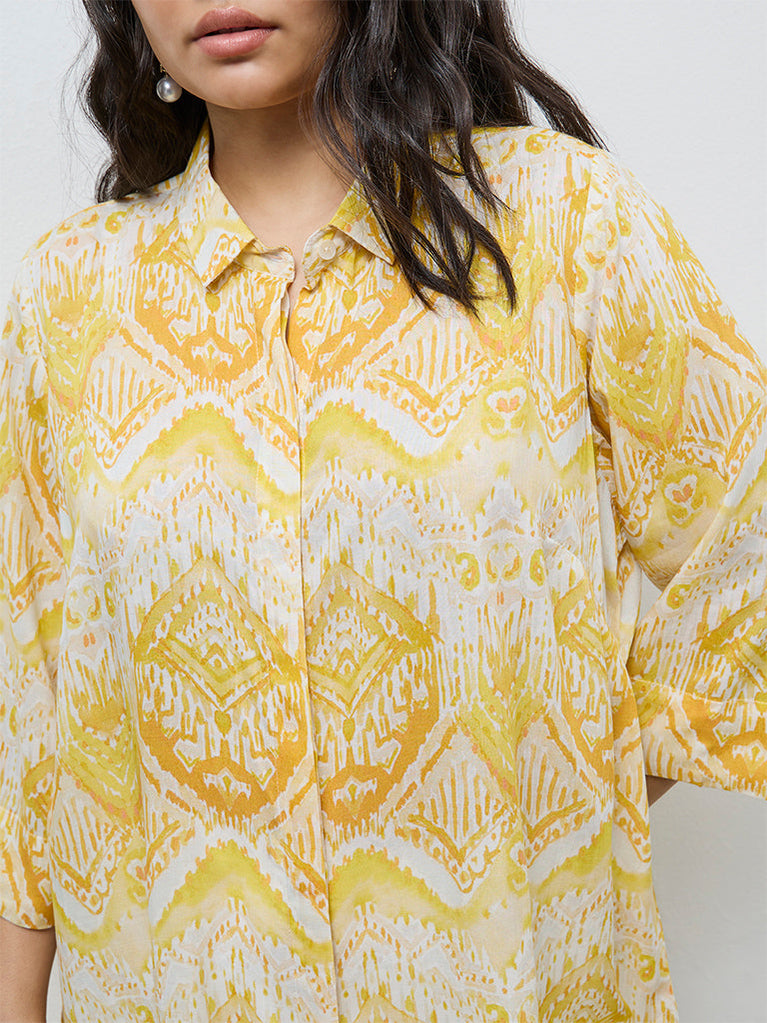 Diza introduces this yellow tunic defined by abstract prints that lend a contemporary slant to everyday dressing. Crafted from lightweight fabric. It offers a soft hand feel that supports all-day comfort. A structured collar, concealed button placket and three-quarter sleeves maintain a composed silhouette with understated polish.