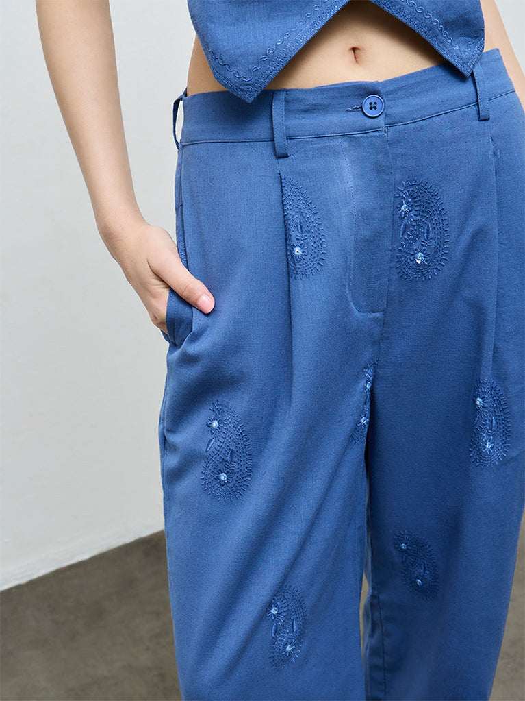 Bombay Paisley Blue Embroidered Cotton-Blend Palazzos