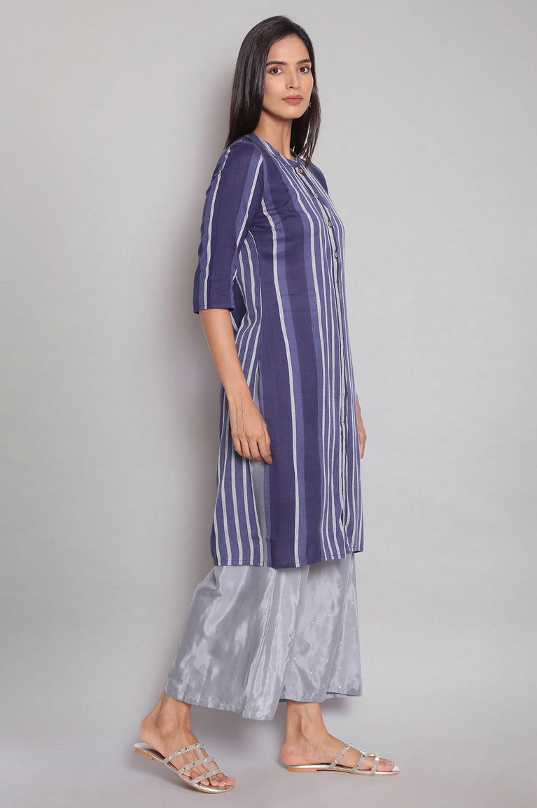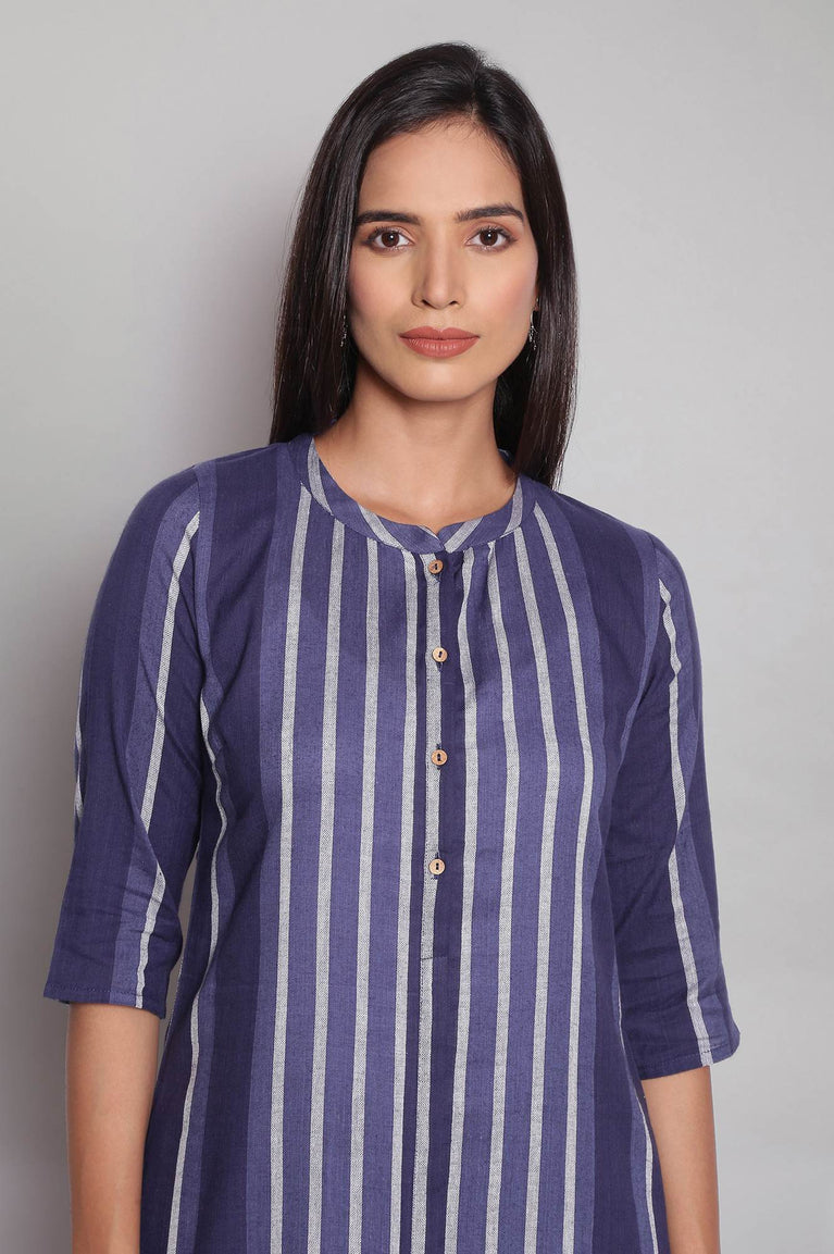 Amp Up Your Casual Wardrobe With This Yarn-Dyed Blue Stripes kurta. Designed In Straight Silhouette The kurta Has Mandarin Collar And Three-Quarter Sleeves.