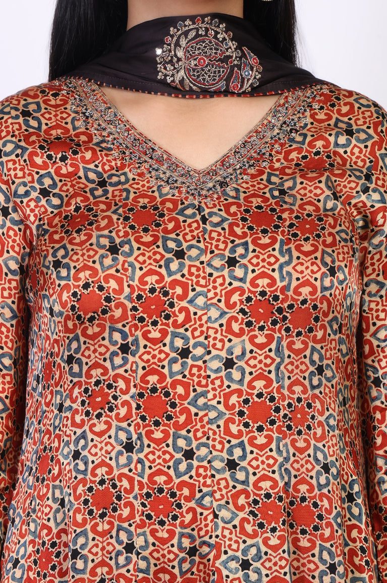 A masterpiece of timeless tradition, this kurta set for women channels heritage charm in every swirl of its flowing silhouette. It’s the kind of ethnic wear that feels both grand and personal. The ensemble paints a picture in rich rust, deep indigo, and warm beige, telling a story through its intricate, all-over ethnic motifs that feel like wearable art. You’ll love the flattering V-neckline, which is meticulously detailed with delicate embellishments, adding a subtle glimmer that catches the light beautifully. The classic Anarkali shape offers a graceful, calf-length flare that moves with you, complemented by comfortable three-quarter sleeves that end in a patterned border. This elegant kurti set is a complete, curated look, pairing the stunning printed tunic with sleek, solid-hued straight pants that create a perfect, harmonious balance. What truly makes this ethnic co-ord set a showstopper is the unique solid satin dupatta. It's designed not just for a beautiful drape but with an integrated, embellished choker-style neckpiece, an unexpected detail that frames the neckline with pure sophistication. This three-piece satin kurta pant dupatta set is opaque and crafted for moments that call for effortless elegance.