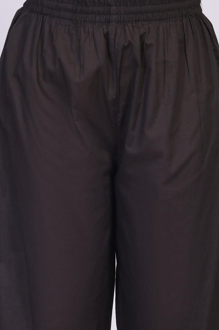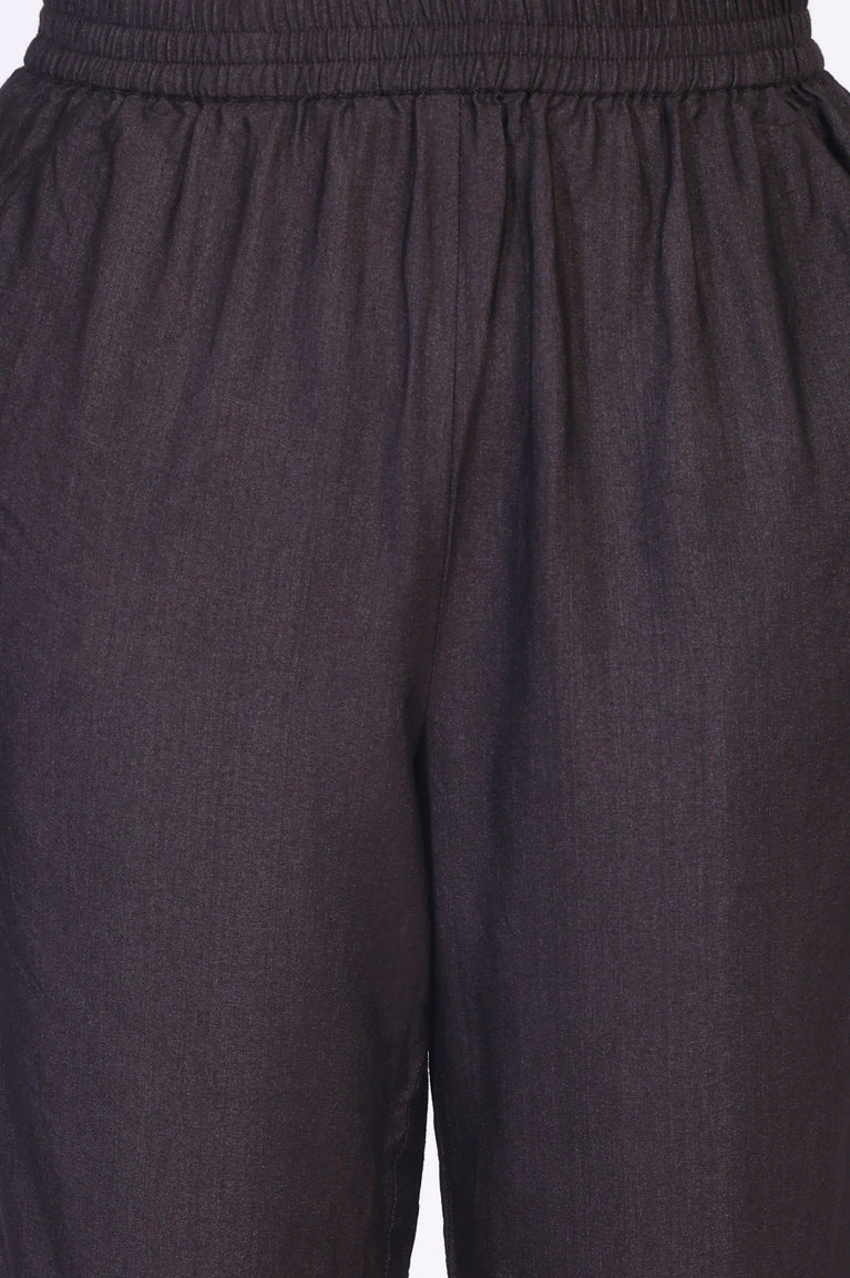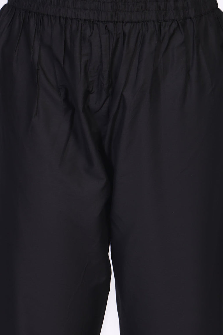 Timeless sophistication reimagined, this Black kurta set for women is a masterclass in understated elegance. The ensemble glides with a quiet confidence, making it a perfect choice for evening soirées and festive gatherings where you want to make a statement. At its heart is a beautifully tailored straight-cut kurta, crafted from a fabric with a subtle, inherent texture that catches the light. The V-neckline serves as a canvas for exquisite Zari and sequin embroidery, a detailed ornamentation that speaks of artisanal craftsmanship. This stunning motif extends to the cuffs of the elegant three-quarter sleeves, adding a touch of shimmer with every gesture. This stunning ethnic co-ord set offers a flawless straight silhouette, thoughtfully designed with side slits for graceful movement and a clean, straight hemline that falls to a chic calf length. It’s paired with comfortable straight pants featuring a fully elasticated waistband for an easy fit, and they echo the theme with a lustrous woven jacquard border at the hem. To complete the look, a matching jacquard dupatta drapes beautifully, tying together this opaque and impeccably styled kurti set. This three-piece ensemble, including the kurta, pants, and dupatta, is your definitive answer to effortless, modern festive dressing.