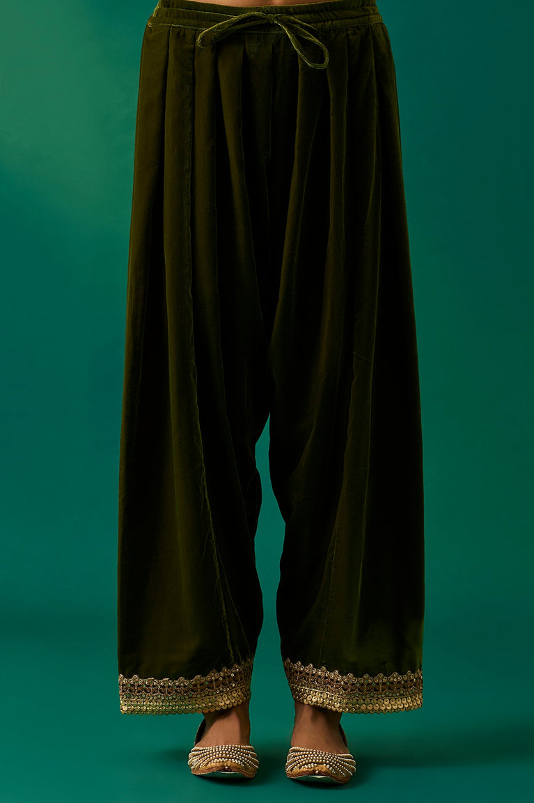 Step into timeless sophistication with this exquisite blue velvet Anarkali kurta set for women. The kurta features intricate embroidery and mirror work on the yoke and sleeves, complemented by a round neckline and a flared silhouette. The full sleeves are adorned with zari detailing, adding a regal touch. Paired with loose-fit salwar pants and a matching embroidered dupatta with tassel detailing, this ensemble is perfect for weddings and festive occasions. The rich blue hue and golden accents create a luxurious aesthetic, while the soft velvet fabric ensures comfort and elegance. Elevate your ethnic wardrobe with this masterpiece that blends tradition and modernity seamlessly.