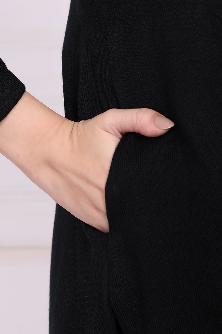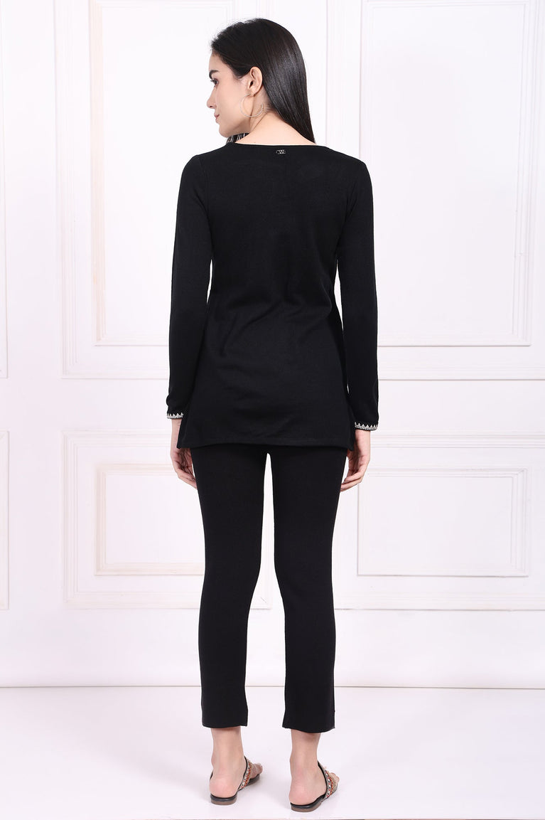 Timeless grace meets cozy comfort in this stunning black tunic, a true masterpiece of winter wear. Crafted from a wonderfully soft acrylic knit, it's the perfect companion for chilly days, offering enveloping warmth without sacrificing an ounce of style. The intricate white ethnic embroidery on the yoke frames the face beautifully, creating a striking contrast that captures the eye and speaks to artisanal heritage. This elegant tunic for women is designed around a charming keyhole neckline, which is further detailed with delicate, handcrafted tassels that add a playful and bohemian touch to the sophisticated design. You'll find the full-length sleeves are finished with matching embroidered borders at the cuffs, echoing the central design for a wonderfully harmonious and polished appearance. Its silhouette is a classic straight cut that flatters any figure, flowing gracefully to a straight hemline, while side slits ensure complete ease of movement. As a perfectly practical touch, it includes discreet side seam pockets. Entirely opaque for confident wear, this winter tunic masterfully combines traditional artistry with contemporary design, making it an effortlessly chic choice for casual outings or relaxed festive gatherings. It’s the kind of versatile apparel you’ll reach for again and again.