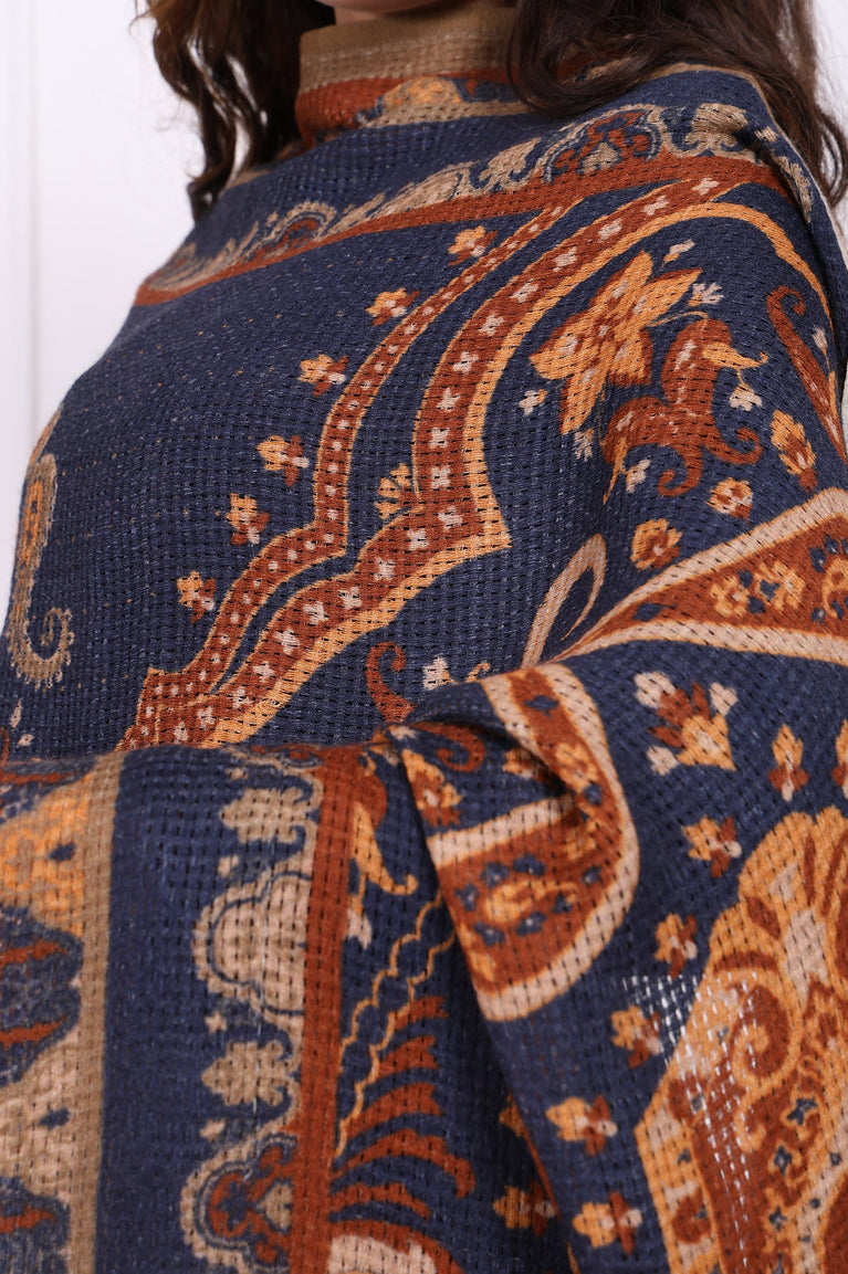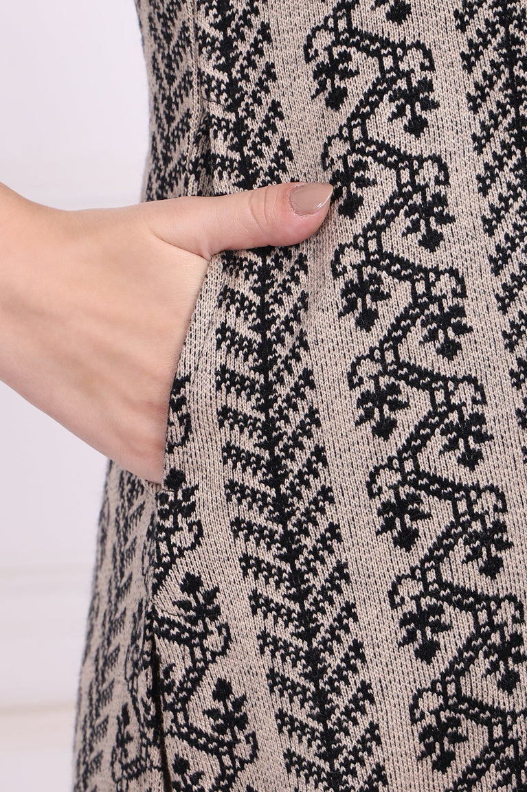 A whisper of winter elegance is woven into every fiber of this stunning piece. This isn't just another kurta for women; it's a statement of cozy sophistication designed for the modern style enthusiast. The color palette, a refined interplay of Toasted Almond and deep Onyx, brings the intricate, yarn-dyed geometric pattern to life. Your eye is first drawn to the graceful V-neckline, designed to flatter as it flows into a gentle A-line silhouette that drapes beautifully. Full-length sleeves offer warmth and an elegant line, culminating in a simple, unadorned finish. With no defined yoke, the verticality of the pattern creates an elongated, slimming effect. The border is a natural conclusion of the woven design, keeping the look clean and cohesive. Fully opaque, this garment offers complete coverage and confidence. A straight hemline with functional side slits allows for graceful movement. This single-piece apparel is your go-to A-line acrylic tunic for everything from crisp morning commutes to relaxed weekend brunches. It’s the kind of winter ethnic wear that feels both timeless and perfectly now.