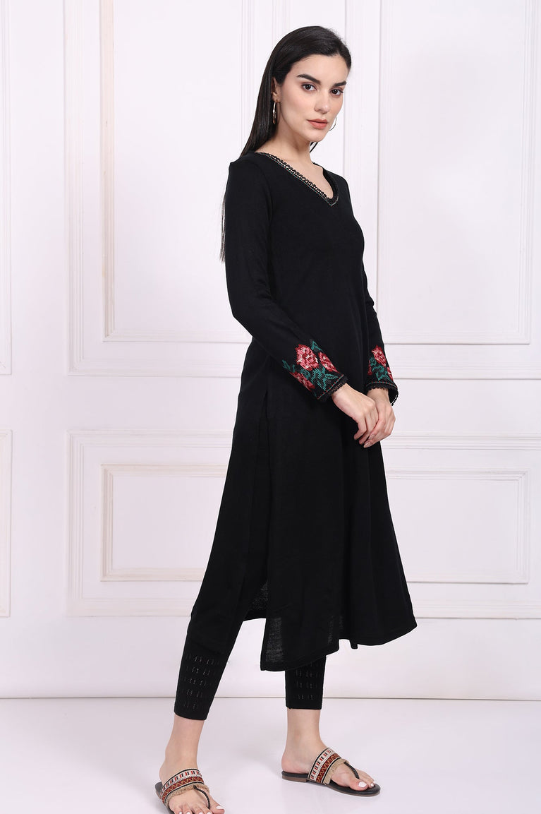 Black Embroidered A-Line Acrylic Winter Kurta