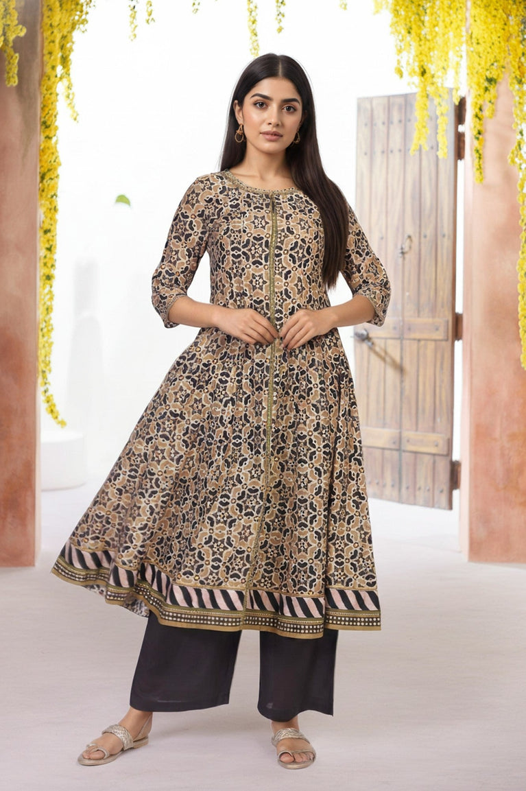 An ode to traditional artistry, this piece feels like a story woven into fabric. It's the kind of garment that makes an impression with its graceful movement and intricate design. This stunning Anarkali kurta for women is a perfect blend of comfort and festive charm, designed for those who appreciate detailed craftsmanship. The silhouette flows beautifully from a fitted bodice, featuring a classic round neckline that descends into an embellished front placket, adding a touch of subtle shimmer. Its comfortable three-quarter sleeves are finished with a complementary border, echoing the detailed pattern found at the wide, flared hemline which swirls with every step. Crafted from a breathable, opaque fabric, this apparel ensures you stay comfortable while looking your best. The all-over ethnic print, rendered in a sophisticated palette of earthy beige and deep black, makes this Anarkali kurti a versatile choice for any daytime celebration. You'll find it's more than just a printed cotton dress; it's a statement of effortless elegance. This package contains one masterfully designed kurta.
