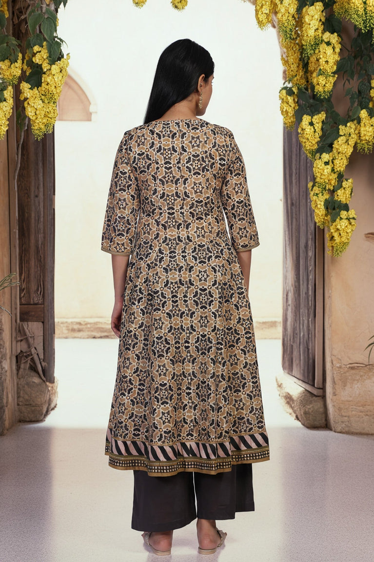 A portrait of heritage and modern grace, this Anarkali kurta set for women is a masterpiece of sophisticated design, perfect for those who appreciate artisanal details. The ensemble features a beautifully flared tunic, rendered in a striking geometric block print that dances across the premium cotton fabric in a palette of earthy beige, deep black, and muted olive. It’s an ethnic co-ord set that tells a story with every motif. You’ll absolutely adore the elegant round neckline, which is delicately highlighted with fine, lustrous embroidery that traces a central front placket. This detail flows seamlessly into a contemporary full-length front slit, a modern touch that adds both visual intrigue and graceful movement to the classic Anarkali silhouette. The comfortable three-quarter sleeves are finished with a simple, clean hem, complementing the ensemble's refined aesthetic. This exquisite kurti set ensures all-day comfort without compromising on style. At the flared hemline, a broad, contrasting border featuring bold stripes provides a perfect visual anchor to the intricate all-over pattern. The set includes a pair of solid, dark-toned parallel pants that offer a sleek, comfortable fit, perfectly balancing the volume of the kurta. This opaque, two-piece set is a testament to timeless elegance.